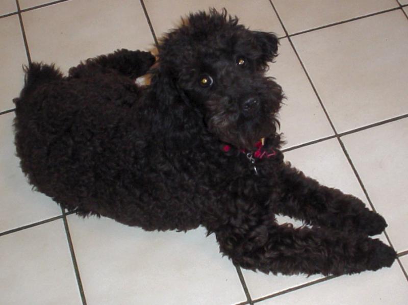Pilgrim is typical of the miniature poodle as he is lively, amiable, playful, eager to please, smart, and enjoys being in the company of his "people". (Bob and me) He is adjusting to his kennel and has met all the BIG dogs-(our Great Pyrenees). He is fearless, and does not know that they are not impressed with his poodle antics. They ignore him. Our cats seem to think that he may be a large black mouse.