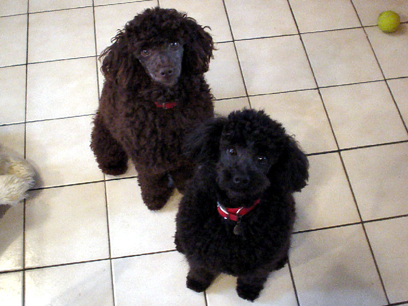 We appreciate all the kind comments about our Poodle pictures and inquiries about the puppies. We are planning to have another litter of puppies in early autumn. I am now starting a waiting list to hold a miniature poodle puppy. The new litter of pups will be all black. As adults, the puppies will be similar in size to their parents, Truffles and Pilgrim. Pilgrim weighs 11 pounds and stands 12 inches at the shoulder. Truffles weighs 13 pounds and stands 12 inches at the shoulder.